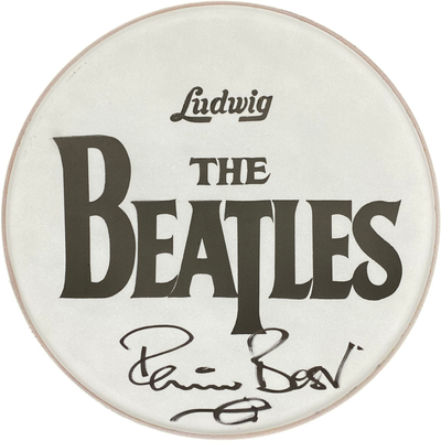ザ・ビートルズのロゴが印刷された小さめのドラム・ヘッドに書かれたピート・ベストのサイン。2013年に書かれたもの。