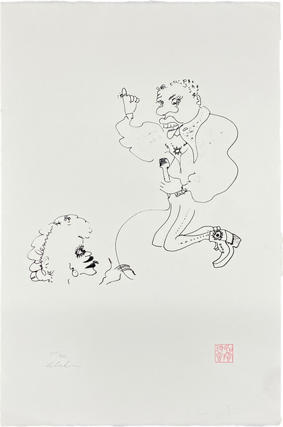 ド派手なシャツにアクセサリー。70年代の装飾過多なロック・スターを皮肉っぽく描いた1枚(1974年作品)。「如雲玲音」( ジョンレノン)の落款とオノ・ヨーコのサイン入り。バッグ・ワン・アートの証明書付き。